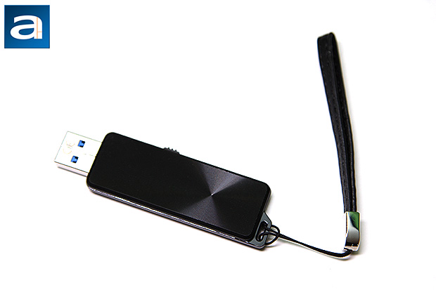 Flipping the ADATA DashDrive Elite UE700 64GB around, we are now greeted with a practically blank side. The unit itself physically symmetrical on nearly all axes. As aforementioned, the opposite side has a blue LED activity indicator with ADATA's logo, drive model number, and capacity; whereas on this side, other than the brushed concentric circle pattern, there is nothing. A glossy black plastic strip extends around the perimeter of the UE700's outer edge to give it a little more style, and interfaces well visually with the USB 3.0 slider switch. The glossy black plastic protrudes as a ring at the back, which can be used to attach an included short leather (Or is it leatherette?) strap, as you can see in our photo above. Unfortunately, the UE700 is not designed to go with your keyring, so if you are planning to do that, you are out of luck. The USB connector itself is blue with gold contact pins to signify its SuperSpeed compatibility.