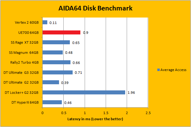 As with all our USB flash drive reviews, I would just like to make it clear from the start that we are, by no means, expecting ADATA DashDrive Elite UE700 64GB to deliver performance competitive with the OCZ Vertex 2 60GB SSD, even though it is a rather old SSD. The Vertex 2 is a Serial ATA 3Gb/s storage device optimized for maximum I/O performance as a boot drive, whereas the DashDrive Elite UE700, while advertised as a fast USB 3.0 drive, is clearly not designed for SSD rocking performance. However, our AIDA64 results do provide interesting insight to the performance of the ADATA DashDrive Elite UE700. Delivering up to 190.8MB/s sequential read, 204.6MB/s random read, and 189.3MB/s buffered read, it is certainly not as fast as the Kingston DataTraveler HyperX and Patriot Supersonic Magnum drives, but leads the Patriot Supersonic Rage XT and DataTraveler Ultimate G3 for the most part. Its 0.9 ms random access time is also relatively high by USB 3.0 drive standards; this is one area where the company could pay a little more attention to. In fact, its latency is the highest among all non-encrypted USB drives we have tested so far here at APH Networks. It should not affect performance all that much, if at all, in real life, however.
