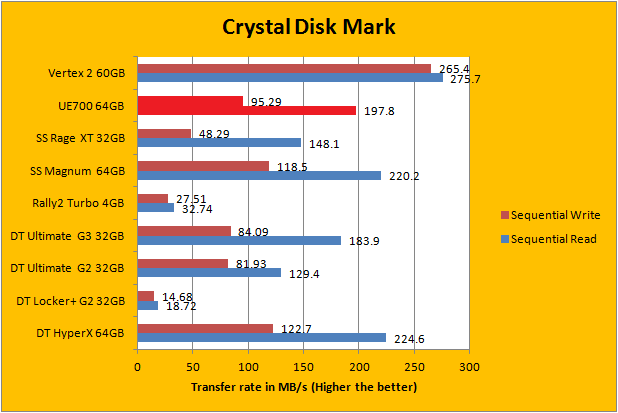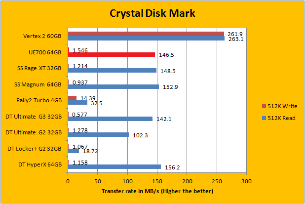 The ADATA DashDrive Elite UE700 64GB continues to perform well as we move into our Crystal Disk Mark sequential read and write results. Once again, it did not post big performance numbers compared to the competition, but these relatively modest results are very commendable nonetheless. It also outperformed all other USB 3.0 drives in the 512K write test. However, once we move beyond it into the 4K and 4K QD32 territory, which requires high input/out operations per second (Commonly referred to as IOPS), the DashDrive Elite UE700 really suffered. As far as the magnitude of the difference is concerned, this characteristic is no different than other USB 3.0 flash drives we have tested in the past. Improving IOPS is one area we would definitely like to see improvement on for everyone selling thumb drives, although for most users, the real world performance based on the intended usage of a USB flash drive will probably not be a significant issue.