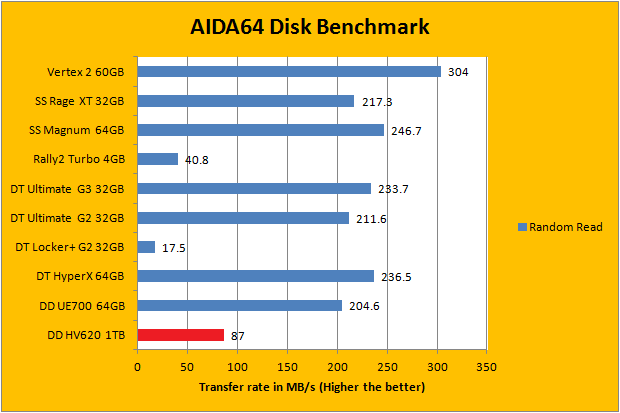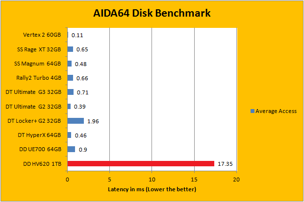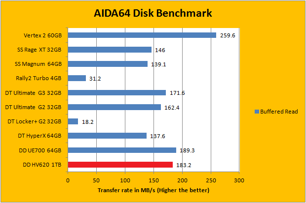 As with all our portable disk reviews, I would just like to make it clear from the start that we are, by no means, expecting ADATA DashDrive HV620 1TB to deliver performance competitive with the slew of flash based memory devices on the list. For example, the OCZ Vertex 2 is a Serial ATA 3Gb/s storage device optimized for maximum I/O performance as a boot drive, whereas a good amount of drives on the list are high performance flash drives. However, our AIDA64 results do provide interesting insight to the performance of the ADATA DashDrive HV620 1TB as a USB 3.0 portable hard drive. Delivering up to 108.3MB/s sequential read, 87.0MB/s random read, and 183.2MB/s buffered read, it is actually pretty darn fast for it being an external 5400RPM 2.5" HDD. Its 17.35 ms random access time is what you would expect from a traditional mechanical disk as well. So far, for 1TB of USB 3.0 storage, I am not complaining about these results.