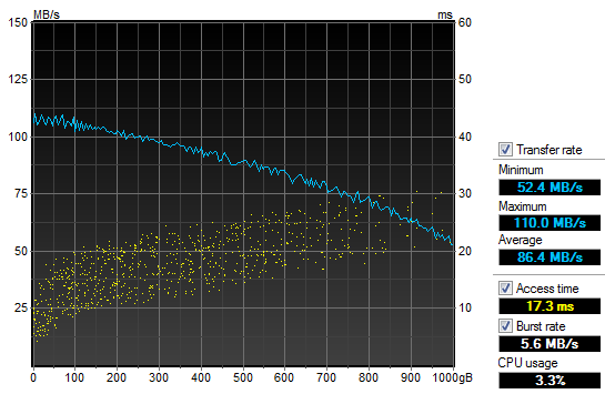 Unfortunately, HD Tune does not generate any fancy independent graph outputs in particular, so I had to edit my screenshot out a bit to make it look better for publishing in a review. Again, like our HD Tach results on the previous page, the line reflects that of a standard hard drive as before, just like how it is supposed to be. It differs slightly in magnitude than the other program -- probably due to testing algorithms used -- but its performance characteristics are identical in practice. The average works out to 86.4MB/s; with a peak of 110.0MB/s and minimum of 52.4MB/s. The ADATA DashDrive HV620 1TB's tested latency is also consistent with what we have seen in AIDA64 and HD Tach.