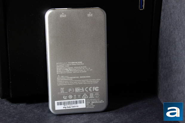 In the picture above, we see the only two input/output ports the ADATA PV100 Power Bank has. On the left is the USB 2.0 output, and on the right is a micro USB 2.0 input. It would be nice if ADATA provided more than one output USB connector, as it would allow for double the charging at the same time. This would probably require a larger battery to be inside the PV100 too, just to accommodate for the extra expected load. Speaking of which, inside the PV100 is a non-removable 4200 mAh lithium-polymer battery, with its full name being lithium-ion polymer or Li-Po for short. In general, Li-Po batteries are made up of many secondary cells in parallel addition to maximize discharge current capacity. A solid polymer holds the lithium salt electrolyte in place, creating cells with increased ruggedness, shape flexibility, and can lower costs of manufacturing. ADATA has also stated the battery inside is designed to have a “6-Way Circuit Protection”, which are overcharge, over-discharge, over-temperature, short circuit, over-voltage, and over-current protection. The PV100 Power Bank supplies up to 2.1A @ 5V, similar to most tablet chargers, and more than the conventional 1A charger that comes with majority of smartphones. Of course, a standard USB 2.0 port is limited at 500mA, which is a quarter of the current at the same voltage.