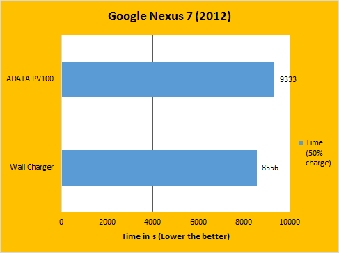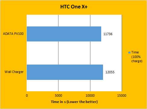 Out of the box, the ADATA PV100 Power Bank was already 75% full, as indicated by the stars that were lit when first turned it on. To optimize the performance of the battery for first use, I charged the battery, drained the battery all the way down, and then fully recharged it without interruption. Once this initial charge/discharge cycle was completed, I unplugged it and put it through our tests. For this, I pulled out two of my daily devices that have been featured in past reviews before, my HTC One X+ and my Google ASUS Nexus 7 (2012). I plugged these devices in, and recorded the results to charge the devices. For the HTC One X+, I charged it from 0 to 100%, as the internal battery is approximately 2100 mAh, and can be charged by the ADATA PV100 Power Bank twice, theoretically. The tablet on the other hand was charged from 50% to 100%, as the internal battery is larger than the PV100. I compared this charging with the stock chargers that came with each of the devices. HTC’s charger is rated at 1A @ 5V, while ASUS’ charger is rated at 2.0A @ 5V.