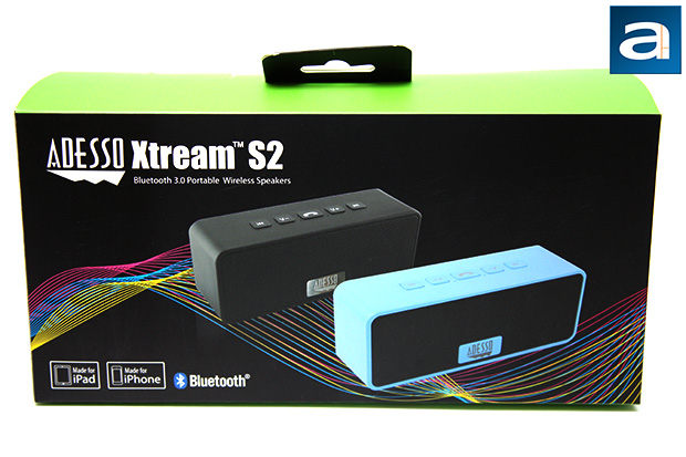 Our review unit of the Adesso Xtream S2 came in retail packaging. Right away, you will see familial resemblance with the Xtream H2. Adesso's logo can be found at the upper left corner, along with the product name and description immediately adjacent to it. Photos of two Xtream S2 Bluetooth speakers -- one in black and one in baby blue -- occupies a very prominent part of the box. At the same time, the black background is enhanced by rainbow colored streamers to give it a little more style. Shifting our eyes to the bottom left corner, you will find three logos, "Made for iPad", "Made for iPhone", and Bluetooth. We will go over what this means later on in this review. Overall, the retail box design is quite clean, and it does its job well. While my colleague Aaron was not a big fan of this style, I do not have a whole lot of beef against it.