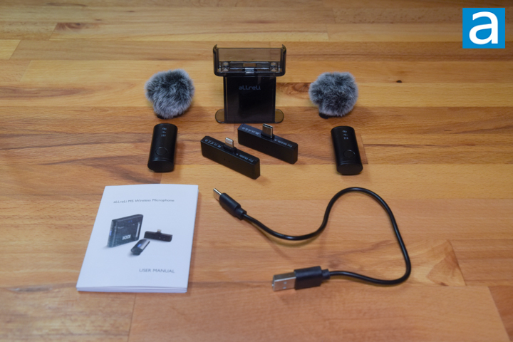 The retail box for the aLLreLi M5 wireless microphone is very minimal. Curiously, the box is devoid of the name of the brand and model of the microphone. The front of the box features a render of the microphone kit in the center with “Wireless Microphone” in small font on the bottom left corner. The right of the box tells you it can be used for direct seeding, interview, exploring shops for shooting, and short video. The left side of the box shows four features including wireless connection, noise reduction, echo or reverb, and volume control. Finally, on the rear, there is another rendering of the kit with all the components pulled out. There is a space of a label near the bottom and a few certification markings.