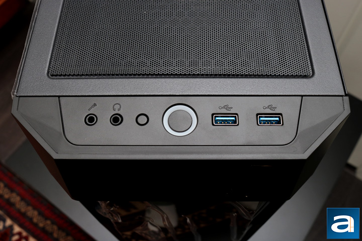 The front I/O connectors are pretty standard. Up here, we find two 3.0 USB slots, the necessary 3.5mm audio jacks, power, and reset buttons. The power button is surrounded by a red LED ring indicating if the computer is on or not. The LED really limits color scheme choices to basic black and red. For any other choice, the red LED will stand out like a sore thumb in my personal opinion. The button itself does not have the best tactile feedback, but it is just a power button. The reset button is the smaller circle right next to it and is also flush with the case, ensuring you will not accidentally press it. The angles around the I/O also fit with the overall gamer aesthetic.