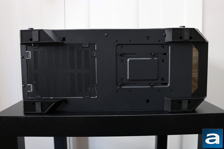 The bottom of the case is standard fare. There is a power supply opening with a bare basics dust filter and a couple of screws that holds the 3.5'' hard drive bay. Loosening the screws make it possible for the 3.5'' bay to be slid closer to the front of the case, creating more room for the power supply at the cost of cooling at the front. Moving the bay to the front leaves barely enough room for either a 120mm or 140mm fan. This also kills the possibility for a 360mm radiator. I had to move the bay all the way forward for my power supply, which has a length of 160mm, excluding the extra couple of millimeters the cables add. Otherwise, it has decent sized feet, ensuring the power supply can effectively draw in plenty of air by raising the chassis a little bit up.