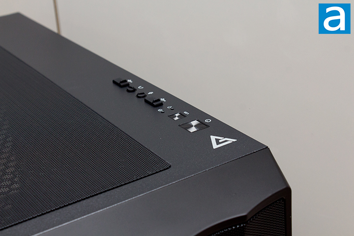The I/O can be found on the top of the case near the front. From front to back, we have the power button, which is slightly bigger than the other buttons. Next, we have a smaller button, being the reset switch. Moving on, we have two USB 3.2 Type-A connectors sandwiching the microphone and headphone jack. The placement of the I/O being closer to the right keeps it out of the way to make managing cables a little easier, but makes access to the ports bit harder. What I mean by this is when in actual use, most users will place their system on the right side of their setup, so the internals of the system are more visible. Placing the I/O on the right makes turning on or plugging anything into the ports slightly harder in comparison to when placed across the front. It is not too big of a problem, because the I/O is still close enough to operate and I personally do not use my front I/O too often. Generally, this is still completely functional.