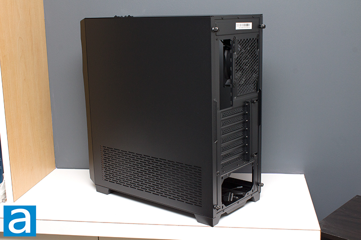 The back of the Antec DF700 FLUX is standard to any mid-tower case. At the top, we have the motherboard backplate cutout alongside a 120mm fan that is already mounted. Underneath, we have seven removable expansion slots. There is a lock on the expansion slots that you will need to remove with two screws before you are able to gain access to it. There is no support for vertical GPU mounting. The right side panel is black in color and helps hide the cables perfectly. As previously stated, there are some holes at the bottom used for ventilation. Although you will not be able to see the cable management, it is still in your best interest, which I will expand on later.