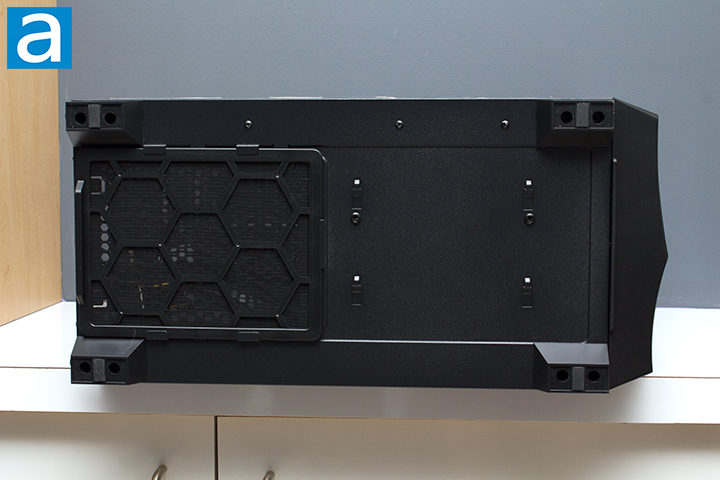 The bottom of the Antec DF700 FLUX has four large feet. When moving the case around, I found the case to still be able to slide, even when components are installed to add weight. That said, it is still sturdy enough to withstand any accidental pushes even though it can slide. The rubber pads on the feet are relatively small measuring in at about 10mm by 30mm, which is the reason behind the ability to slide around. These feet provide about 20mm of clearance, sufficient for PSU airflow. There is a single dust filter designed for the PSU. The filter is very easy to remove, as you can simply pull a hinge on the back without having to flip over the case.