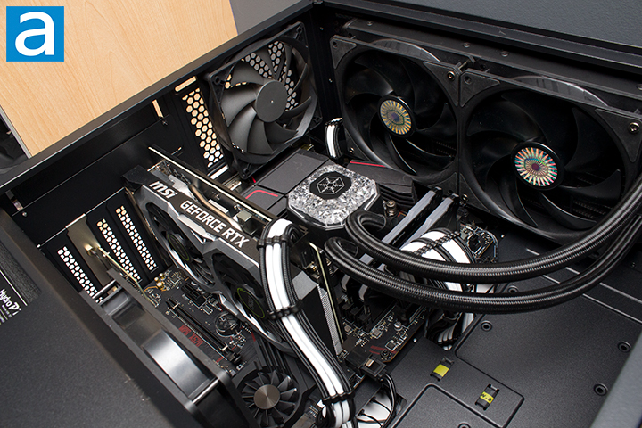 Upon installing my SilverStone IceGem 280 CPU cooler, I found there to still be an adequate amount of space to route my CPU cable through with only a small hassle. Installing my FSP Hydro PTM+ 850W power supply was as simple as installing a PSU in any other case. I simply plugged in any necessary wires, then gently slid it underneath the shroud. It is important to remember to plug in all the cables prior to installation, as you will not have much room to plug them in after it is already installed. Once all my other components were installed, I began installing my MSI GeForce RTX 2060 Super Ventus graphics card. I simply removed the second and third expansion slot and tucked in my GPU. After all my components were in place, I got to work with cable management.