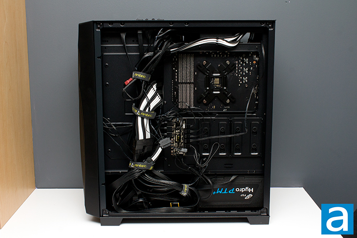 Despite my cable management not being perfect, it does not really matter from a visual perspective as the right panel is not glass. Although this may be the case, pun definitely intended, it is still important to try your best as better cable management can help with allowing for better airflow, which is what this case is all about. The Antec DF700 FLUX provides an adequate number of tie-down points for the Velcro straps. Routing cables was easy enough using the Velcro straps to bunch up the cables. It would have been nice to have more points further left to make for more room for cable management. As previously stated, there is about 30mm of space near the front of the case to route the cables and about 25mm of space behind the motherboard tray. This is an adequate amount of space for most builders.