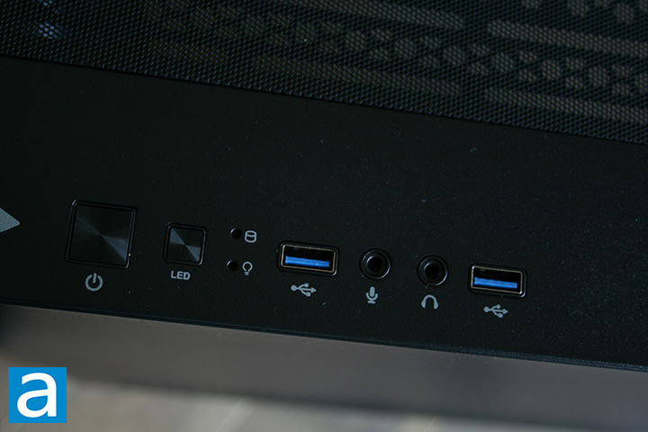 At the top of the case, we can see the I/O panel, which is located on the eastern edge. Going from left to right, we have a square power button, LED control button, storage and power LED indications, USB 3.0 Type-A port, 3.5mm microphone jack, 3.5mm headphone jack, and another USB 3.0 Type-A port. The lack of a USB Type-C port is disappointing, given it is 2022, but not a deal-breaker by any means. On the positive side, I really like that the design employs two USB 3.0 Type-A ports. It is always nice to have two USB slots that offer fast transfer speeds. One noticeable change here is the lack of a reset switch, which has seemingly been replaced with an LED control switch. This is disadvantageous for users who find it easier to use a button to reset their PCs. It is true that the reset switch is not an essential I/O button, but I wish Antec has found a way to fit that extra button without sacrificing anything else. We know that it is possible to have a specialized button and reset button together as seen on the be quiet! Silent Base 802. This is also different from the Antec P10 FLUX and DF700 FLUX, which has both replaced their reset switch with a fan control switch.