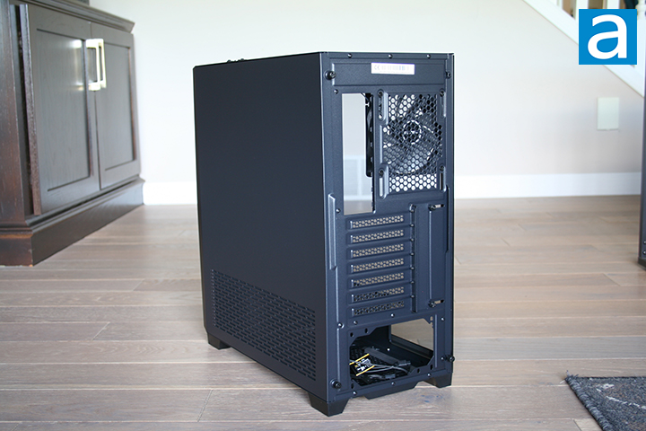 The back of the case is exactly what you would expect from an ATX mid-tower. A pre-installed 120mm fan is mounted at the top right beside the cut-out for the motherboard I/O shield. Seven horizontal expansion slots can be seen directly below the fan and motherboard opening. All seven expansion slots can be taken off to make room for GPUs or any expansion cards that may take up an expansion slot on your motherboard. Vertical GPU mounting is not supported on the DF800 FLUX, which does not take away from this relatively competitively priced case. An opening for the power supply can be seen below the horizontal expansion slots held on by regular screws. The right side panel has ventilation holes near the bottom to draw in air for the reverse fan, which we will be discussing later on in this review. You can also find a magnetic dust filter here to keep dust from getting into your PC via this intake.