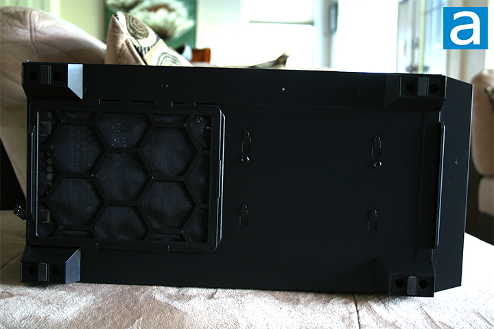Two sets of large feet can be seen at the bottom of the case. There is a small pad in the middle of each feet designed to reduce vibration. Measuring approximately 5mm in width and 12.5mm in length though, I feel that there is only so much vibration that they would realistically reduce at such a small size. The feet are also removable with two Phillips head screws per foot. A large removable dust filter can be seen near the back. This dust filter will help maintain clean airflow for your power supply. I am also happy to see that the slits are not terribly thick, meaning they will not block a lot of the airflow.