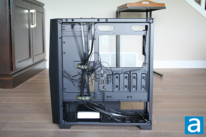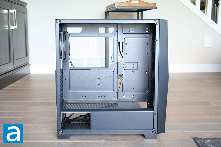 Overall, the interior build quality of the Antec DF800 FLUX is also solid. All the components needed for building a computer can be nicely accommodated and kept cool. The paint job quality of the interior is clean and looks just as nice as it did on the exterior. More importantly, there is a decent amount of room to route cables, and large accessible openings allow easy connections between the PSU and the motherboard. There is also a good number of mounting options for cooling fans.