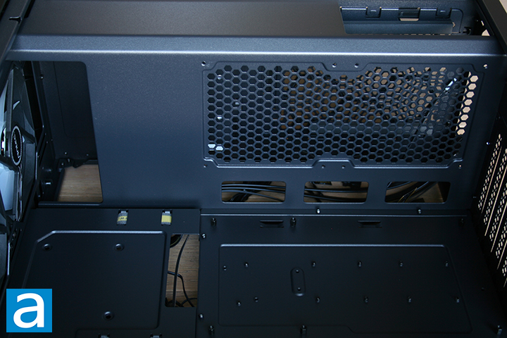 As noted earlier, we can see the PSU shroud is not entirely solid when taking a closer look at the bottom. Three cable routing holes can be seen directly on top of the PSU shroud. However, I feel like these cutouts are a little too close to the motherboard area and could potentially make for a tight cable squeeze, especially for users with regular ATX motherboards.