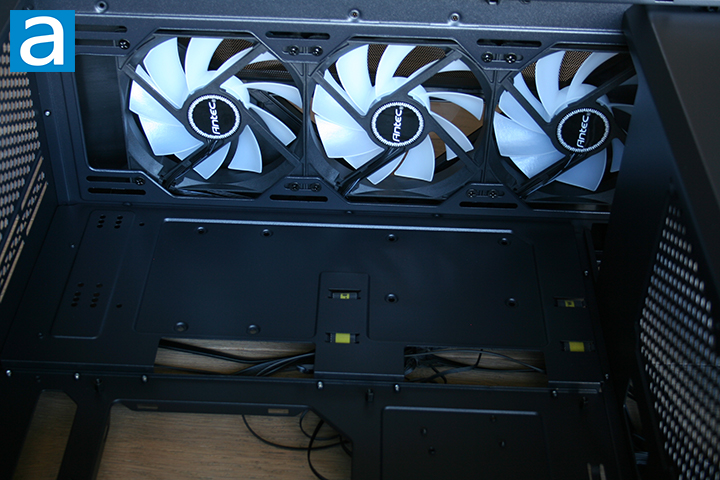 What is interesting is the purpose of the two 120mm fan mounts on the PSU shroud to place a reverse fan, which is designed to intake air from beneath the PSU shroud. The reverse fan has been seen on other Antec cases such as the P10 FLUX and DF700 FLUX. This is also why the side panel on the right has ventilation holes, as it will draw air from the outside into the area underneath the PSU shroud, which will be directed towards the GPU through the reverse fan. However, as suggested by Antec, this only really works by mounting the reverse fan on the middle section, as the PSU blocks most of the area underneath the rear mount. The PSU's existence will greatly reduce the airflow, which will defeat the purpose of the reverse fan in the first place. I suppose you could place an additional regular fan on the rear mount to bring additional airflow over your power supply, but I would consider that unnecessary. In the end, I do not think there is anything wrong with just sticking to five fans, which is already a lot. That, of course, is not including the additional space on the top for radiator mounting or placement of other case fans.