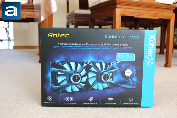 In front of us is the retail packaging of the Antec Kuhler H2O 1250, sans the shrink wrap, so it appears better in photos. Antec has utilized a mainly blue and black theme, which emulates an Arctic icy cold look. Antec's logo is found in its regular yellow on the top left hand corner. The cooler itself is also shown on the front box, with the same icy blue or frost-like aura around it. I can assure you the Kuhler H2O 1250 does not actually have any blue on the fans nor the pump, as you will see later on. If it were to actually look frosted, I would be thinking the liquid inside has leaked, haha. I should mention this is the largest liquid cooler in the Antec Kuhler lineup, and therefore your case must be able to support a 240mm radiator. Most mid- to full-tower cases will have no problem meeting this criteria, but it should be noted nonetheless. If you are working in tighter environments, Antec also offers the Kuhler H2O 950 and 650, both with a smaller 120mm radiator footprint. Other features and specifications can be found underneath the picture, as well as around the entire retail packaging. As it is hard to read the specifications on the box, I will pull them from the manufacturer's website for your perusal: