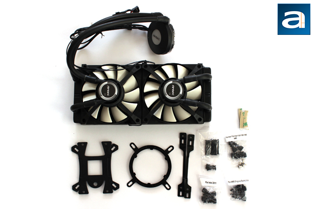 Opening the Antec Kuhler H2O 1250's container up, you can see everything is held in a large cardboard tray with a thin foam sheet covering the top. This follows Asetek's general packaging, as Asetek is the actual OEM of the Kuhler lineup. However, what you might get with Antec is the additional parts to make the installation as straight-forward as possible. At the very top of the photo is the Kuhler H2O 1250. Underneath, from left to right, is a cooler plastic backplate, a metal cold plate mount, a pair of spacers for the radiator, and more small baggies with screws and nuts inside. There is also some 3M double-sided adhesive foam to mount the backplate to the back of your motherboard. Not included in this picture is also an installation guide manual, as well as a CD with Antec's GRID software, but this will be covered later. Let us take a closer look at the Kuhler H20 1250 itself.