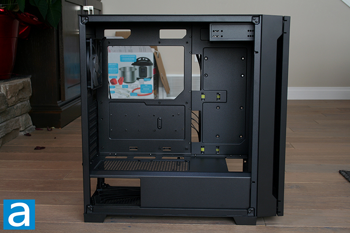 Both side panels are easy to remove thanks to the large thumb screws holding them in place. The thumbscrews are very comfortable to grip and can be easily unscrewed with your hands. As seen from the previous page, neither side panels have tempered glass and are instead treated with foam padding to absorb any inside noise. With the side panels removed, we can view the interior of the Antec P10 FLUX. The black color of the case is consistent all throughout the interior, which is nothing special per se, but is still nice to look at. The PSU shroud covers a good portion of the bottom with the exceptions of having an opening in the front for radiator mounting, some cut-outs just below the motherboard area, and ventilation holes directly on top of the shroud. The cutout on the bottom left side aids with handling the PSU when installing it, but is more traditionally used to display your power supply. In this case, this cutout makes a little less sense aside from helping install the power supply as there is no tempered glass side panel. The ventilation holes also offer support for two 120mm fans aside from allowing airflow from below and above the PSU shroud.