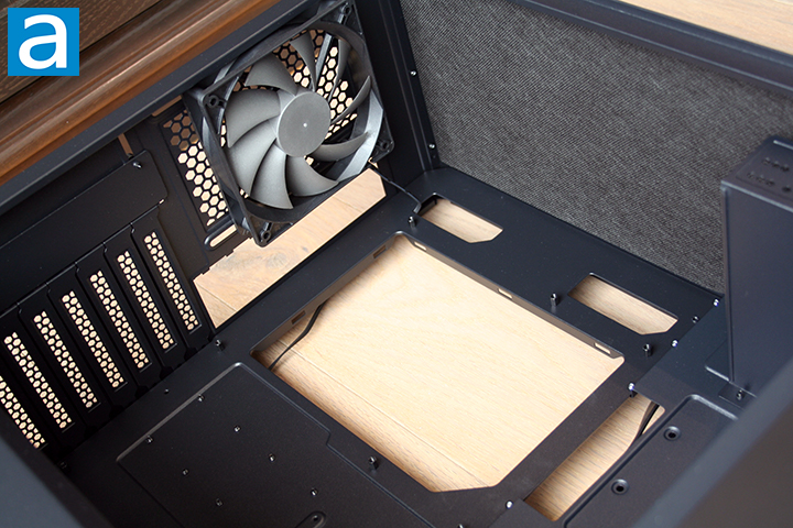 A change that could make a difference is adding a fan or radiator mounting holes at the top. Instead, like the side and front panels, the ceiling of the case is padded with the same noise reduction foam. If it was not clear already, we can see that Antec is really pushing the P10 FLUX to be silence-focused, especially with the sacrifice of a fan or radiator mounting option. On the left side, we can see the pre-installed 120mm exhaust fan. Unfortunately, the rear mounting position can only fit fans at a size of 120mm. While the general design of the back interior is fine, I think some users may be disappointed by the lack of mounting options here, as a radiator or fan cannot be placed at the top and the rear cannot fit a 140mm fan.