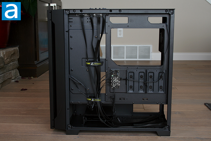 Looking at the back of the P10 FLUX, we can see the various front cables routed closer to the left side. The clearance between the panel and tray at the front came out to around 33mm and the rear measuring around 25mm. Straps branded with the Antec logo can be seen holding the cables in place. I think cable management would be fine for this case with all the space below the PSU shroud. A fan controller can be seen in the center with the pre-installed fans already connected to it. The controller is capable of supporting six voltage-controlled fans, which is appropriate for the 6-fan capacity of this case. This fan controller is powered by a SATA power connector. All the control comes from the fan controller button on the front panel, which allows for two options: High or low. I wish Antec had at least made an option for three different fan speeds rather than just high or low. Even if this is just an $80 case, I still think that a medium fan speed would be very helpful for airflow options and noise, especially for a performance-centered case. An even better option would be a motherboard-based PWM controller.