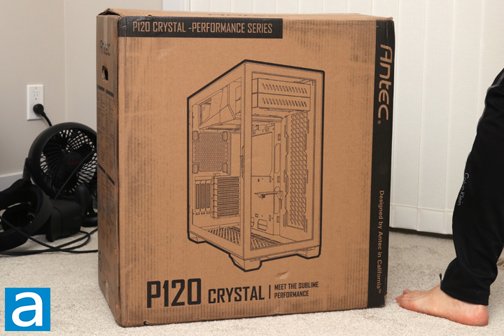 Today's review unit of the Antec P120 Crystal arrived from Antec's offices in City of Industry, California. Traveling with UPS and their Standard ground service, this box arrived in excellent condition with no dents or bruises to be concerned about. My colleague Jonathan Kwan hand-delivered this box to my place so of course, he decided to get his foot in the photo for our review -- literally. Even so, this box doubles as both its shipment box as well as its retail box. As such, this is a typical brown corrugated cardboard box with black printing on it. It shows off the case in a scaled-down look. Antec's logo can be found down the right side, while the P120 Crystal name is found at the bottom. A tagline of "Meet the Sublime Performance" can be found nearby. Otherwise, around the sides we have some specifications of the Antec P120 Crystal for you to view before you buy.