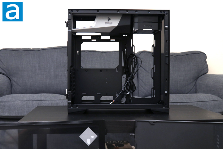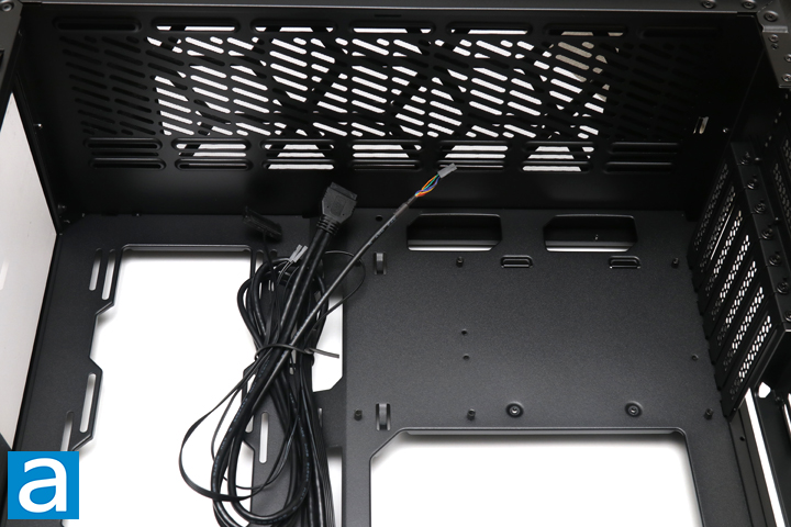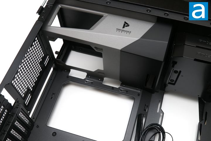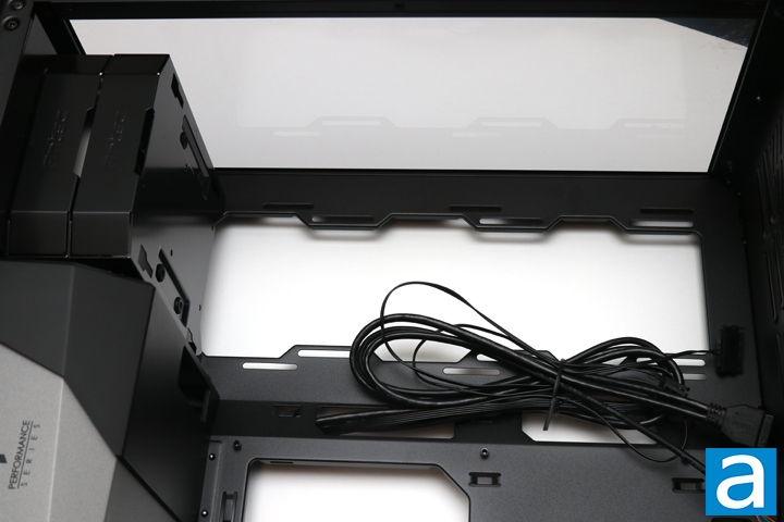 Once the panels are off, you can get a better look at the interior layout of the Antec P120 Crystal. As you already know, this case utilizes an open concept with little obstruction from front to back. The main division can be found at the top that holds the power supply as well as an extra mounting area for drives, though it is not solid all the way through. Large holes exist in both the shroud and the drive bays to allow air to pass through. This is classified as a mid-tower ATX case, which means motherboards from mini ITX to extended ATX can fit inside. All of the cables come neatly wrapped with a twist tie and secured to the cabling holes. The interior matches the rest of the case with its black finish, with the exception of the purposely contrasted gray power supply shroud. Antec's "Performance Series" marking can also be found on the shroud.