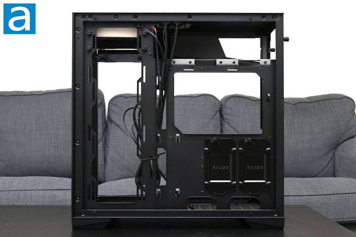 At the back of the Antec P120 Crystal, we have a relatively standard layout even with the power supply located at the top. Starting from this location, Antec has provided quite a bit of space to mount your power supply and hide excess cables in this area. Down the back, you can see there are two more drive sleds so users can install an additional two 2.5" drives without any issues. This is in addition to the two drive cages found at the top by the power supply area. From here, you can see the two thumbscrews on each tray used to secure it to the rest of the enclosure. In terms of cabling space, I think the Antec P120 Crystal actually could have been made wider to accommodate thicker cables. We still have up to 18mm of cable space in the wider gaps, so we will see how this translates when we try installing our computer into the case. Otherwise, you can see all of the holes, from the motherboard to the cabling holes, have been rounded off to prevent users from accidentally cutting their fingers on the edges.