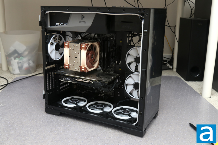 From this angle, you can see almost everything is installed in the Antec P120 Crystal with extra LED lighting strips at the top and bottom, courtesy of SilverStone, and two Noctua fans attached to the heatsink. You can also see I have now mounted my MSI GeForce GTX 1070Ti Titanium here. While I do not have a vertical mounting plate to take advantage of the three slots in this case, Antec has included an aluminum bracket inside to prevent video card sag. It mounts near the side ventilation and slips under your video card to prop it up. This is an easy-to-use implementation and it stays hidden while performing its job. It is also pretty adjustable for various card thicknesses and should extend out enough for both longer and shorter cards. Otherwise, with all of the lights and fans here, I put the swinging door and sliding panels back on, plugged in my machine, and hit the power button.
