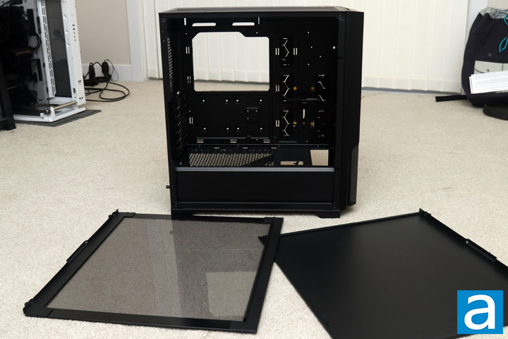 Getting inside the Antec P20C involves loosening the captive thumbscrews at the back for both side panels. For the tempered glass pane, once the captive thumbscrew is loosened, the side slides off. The panel has a steel frame where the captive thumbscrews exist. A similar frame can be found on the opposite side with notches that fit into the steel frame of the rest of the chassis. There is a small lip that the tempered glass sits on while it is in place. Thanks to the notches at the front, the tempered glass stays in place even if the thumbscrews are loose. Unfortunately, there is no padding between the side panel and the rest of the P20C, which would prevent any damage between the metal and glass. Otherwise, this window is tinted, which should reduce the visibility of black cables inside. It also has a black rim around all of the edges to hide any handling marks you might make while removing or installing the panel. The steel panel is removed in a similar fashion and features the same front notches to keep it in place.