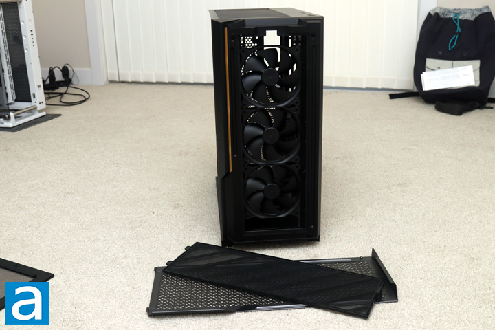 The front panel pops off in multiple sections. First, the steel triangular-grid panel attaches to the plastic front frame with a ball-and-socket joint. Once that is removed, you can then take off the plastic mesh filter underneath. Finally, we are greeted with the three pre-installed 120mm fans. Unfortunately, Antec has not provided much for details about these fans. However, they do terminate in 4-pin headers, which shows they are PWM controlled fans. Otherwise, there is no RGB LED lighting here on the fans, and their all-black design matches the rest of the case in its design.