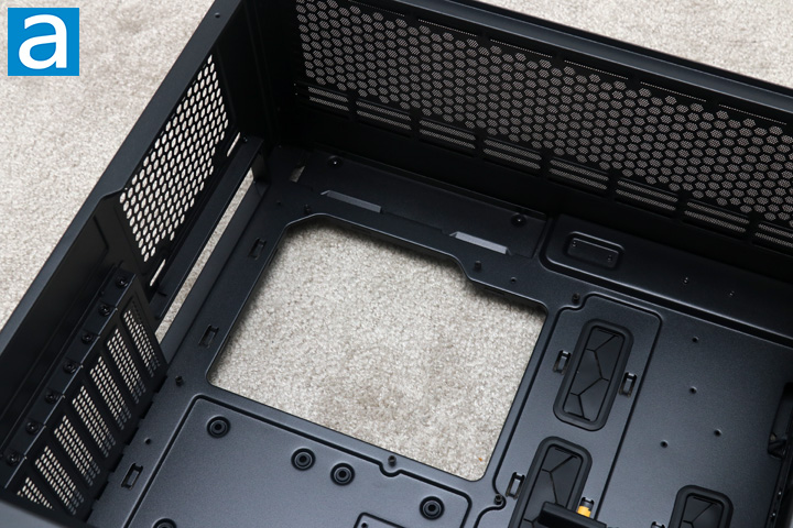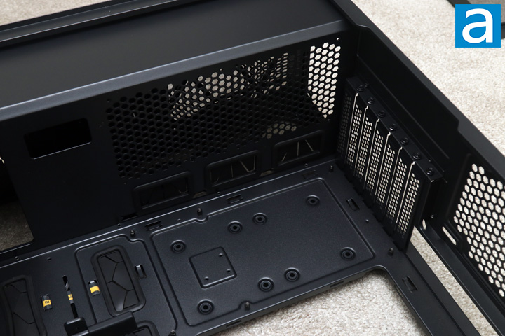 Down the back and to the bottom, we can see the expansion slot covers. There is a total of seven, which is typical for a mid-tower case. These slots feature a bridgeless design. Antec says this is to allow for support for vertical mounting of your graphics card, although this would involve removing all of the slot covers. At the bottom, you can see the perforations on the divider between the power supply and the rest of the case. There are also three holes at the back for connecting front I/O connectors and other headers at the bottom of your motherboard. These all have rubber grommets on them, which is much appreciated. There is one more hole closer to the glass side panel where users can route the PCIe power cables to their graphics card.