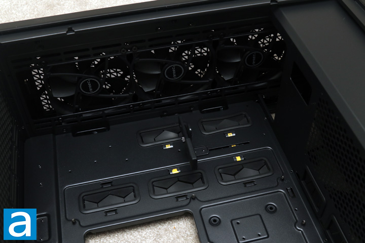 At the front, we have the other side view of the three front fans. They are mounted on rails to allow users to install more cooling options here. This includes up to three 120mm, three 140mm, or two 185mm fans. It is nice to see support for the larger, less common fan sizes. Otherwise, users can also install a radiator up to 360mm in size. It should be noted that 360mm radiators at the front are limited in thickness with a maximum space of 60mm. Regardless, it is great to see the support for a total of two larger radiators inside the Antec P20C. Moving on, you can see we have even more rubber grommets and holes to pass cables through. In between the two rows of holes, we have a metal bracket with rubber padding. This is actually a GPU support bracket that slides up and down on a rail. It has a rotating arm that extends out to prop your graphics card while staying secured to the back of the P20C. It is a pretty simple design, but it does the job. Otherwise, all of the openings that are not grommeted are folded over with smooth edges to prevent any cuts to cables or your fingers.