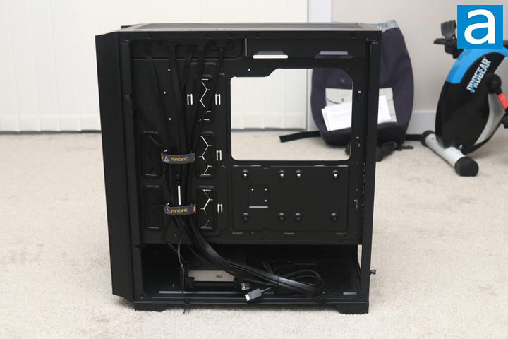 At the back, we have all of the cabling space to help you with building inside the Antec P20C. First, you can see the two rows of grommeted holes to pass cables to the motherboard. In between, there is a set of two hook-and-loop straps with Antec branding on them to keep cables in control. Antec has included one more Velcro strap as well in the accessories box. All of the front I/O cables can be seen in black passing through these two rings of straps. Otherwise, we have even more tie down points around the back. A total of 22mm of space is provided between the side panel and the enclosure to help with routing cables around. While this may sound tight, due to the way the side panel attaches to the rest of the case, there is a bit of wiggle room. Unfortunately, we do not have any fan controller included, but Antec did provide a four-to-one PWM connector cable so the front fans only take up one fan header on your motherboard.