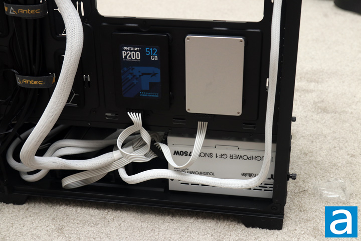 Continuing here, I installed my two drives, the Patriot P200 512GB and OCZ ARC 100 240GB into the slots above the power supply. The friction mounting method worked well in keeping these drives in place, even when the thicker SATA cable was plugged in. In the past, I have seen other cases with this same design not hold the drives secure enough, as the SATA cables would provide enough resistance to push them out of the mount. However, this was not the case with the P20C, which is a positive.