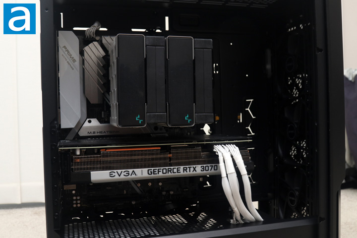 My next step involved installing my motherboard, which is an ASUS Prime X470-Pro with an AMD Ryzen 7 3700X installed and a set of Patriot Viper RGB DDR4-3600 2x16GB sticks onboard. On top of the processor, I installed a DeepCool AK620, which has a height of 160mm. Antec limits a maximum height of 170mm, which is a sufficient amount of space for larger coolers like the AK620. I then installed my video card, which is a EVGA GeForce RTX 3070 FTW3 ULTRA GAMING that measures 300mm long. There was more than enough space at the front for the card, as the manufacturer specifies a maximum length of 375mm. Afterwards, I plugged all of the cables into the motherboard or my graphics card. I also used the video card support bracket to prop the video card up. This was straightforward to install and made a notable difference for my heavy GPU.