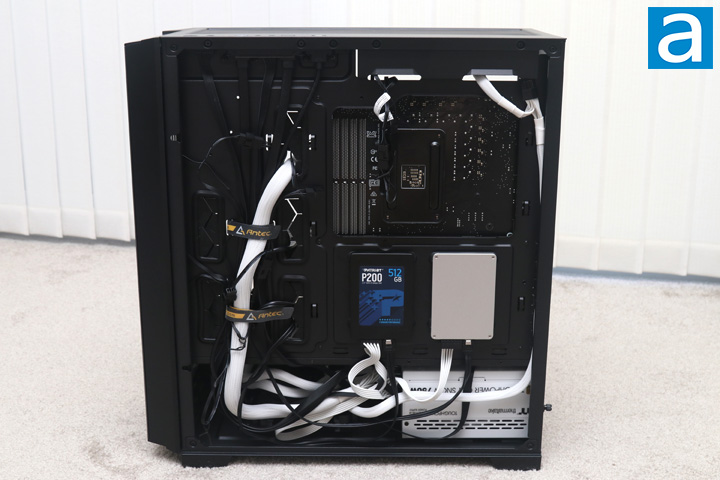 Lastly, I cleaned up my cables by using the Velcro straps on the side and pushing some extra cables to the side and the basement of the Antec P20C. From this photo above, you can see I could use the cable ties a bit better to keep the cables in place, but this is manageable. I think Antec provided just enough space in this back area to allow for easy cable management. The Antec P20C may not have the benefits of a large working space as a compact case, but I think the overall build experience was a smooth one. With everything plugged in here, I closed up the side panel easily and placed it near my desk.