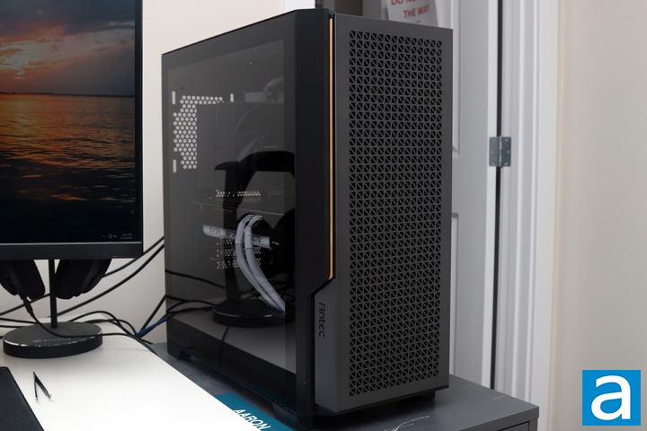 Afterwards, I plugged all my peripherals into the back and turned on the system. The three front fans spun up and my system started. It was definitely a bit of a surprise to not see much for RGB elements, especially as I had just come from the Thermaltake Ceres 500 TG ARGB Snow. In fact, there was one night where I went to sleep without turning off my machine because I did not realize it was powered on. However, one thing I appreciated immediately was the fact the stealthy looks of the Antec P20C were accompanied by a relatively quiet set of fans. According to our standard APH Networks sound scale ranges from 0 to 10, where 0 is silence and 10 is loud, I would rate the Antec P20C around a 2.5/10. There are no dedicated materials used to dampen noise in the P20C, so it is impressive to see these three fans maintain a low noise output.