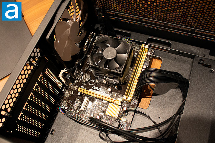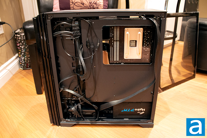 I know my cable management could be substantially better, but given the back panel is not glass, I thought it would be unnecessary to do a perfect job. The case does come with some twist ties and zip ties for cable management. Unfortunately, there is not a lot of space behind the motherboard. There is only about 8mm of space between the motherboard tray and panel. Cable management was slightly better near the front of the case with a gap about 25mm without the inclusion of two 2.5" drives available for installation. The PSU chamber is partially blocked off by the drive bay, which makes hiding cables underneath the shroud significantly more difficult. The break alongside the motherboard makes passing through cables from the back of the case to the front of the case very easy, minimizing visible cables seen through the glass side panel assuming there is not too much cable clutter in the way. With the most minimal amount of parts required to have a functioning computer, I still found it hard to fit all of the required cables inside this case. I would have liked to have more space to route my cables as I am not too sure whether or not a higher end system could fit inside this case given, I did not route another cable for GPU power.