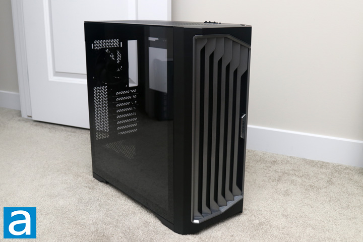 On first glance, the Antec Performance 1 FT does not necessarily seem like a large case, but there are some things that make it stand out. The chassis is mostly black in color, but its front gray grille pops out visually. Its asymmetrical front with vertical bars is a neat look that sort of reminds me of the front of a car. These bars do not face directly forward, but are angled to the side. Antec's name is printed on a small trapezoid portion of the right edge, which also doubles as a handle to remove the front panel. Around the case, we have a mostly rectangular prism shape with sharp corners everywhere other than the front. From this angle, you can also see the tempered glass side panel. All in all, the Performance 1 FT is rather striking for its front, but the rest of the frame is pretty tame. Even so, I do appreciate the look of the Antec Performance 1 FT, with its large front to allow air to flow through.