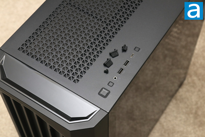 The top-facing inputs and outputs can be seen here. From the front to the back of the Antec Performance 1 FT, we first have a large square power button followed by a smaller square reset button. Next, we have a combination 3.5mm headphone and microphone jack. Unfortunately, we do not have a splitter included in the box. Next, there are two USB 3.2 Gen 1 Type-A ports. Finally, we have a USB 3.2 Gen 2 Type-C port. All of these ports are given rubber covers from Antec to prevent dust from settling in here. While I usually leave my ports exposed, I do appreciate the inclusion here. The last button is marked "Temp", and this is used to control what is displayed on the glossy area. Indeed, while it just looks like a black glossy plastic, underneath is a three-digit seven-segment display to show the CPU or GPU temperature. This button cycles through the two options or turns the display off. We will see the display later when we look inside. Interestingly enough, we do not have any power or drive activity light, although the top display would double as one since it only turns on when the computer is on. Otherwise, there is also the ventilation area at the top. The large opening is made up of triangles and a mesh filter exists underneath. This top panel can be easily removed so users can clean the filter.