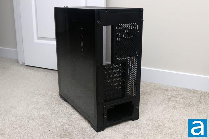 From this angle, you can see the second tempered glass panel on the other side of the Antec Performance 1 FT. Otherwise, the backside looks pretty typical. At the top, we have the motherboard I/O cutout with an exhaust area next to it. This has rails for users to mount a single 120mm fan here, although it is already occupied. Underneath, we have eight expansion slots, which are secured in place with screws. These slots are bridgeless and therefore are not divided by the rest of the frame. The slots also have perforations to allow air to pass through here. I do appreciate the unity in design, as we have the same triangle pattern at the back as we have on the top panel. Beside the slots, we also have two pairs of cable tiedown points on the outside, and these are used to help with exterior cable management as you will see later on. Moving forward, we have a power supply opening at the bottom of the case with a bracket around it to mount an ATX PSU. This bracket is held on by captive thumbscrews, just like the two side panels.