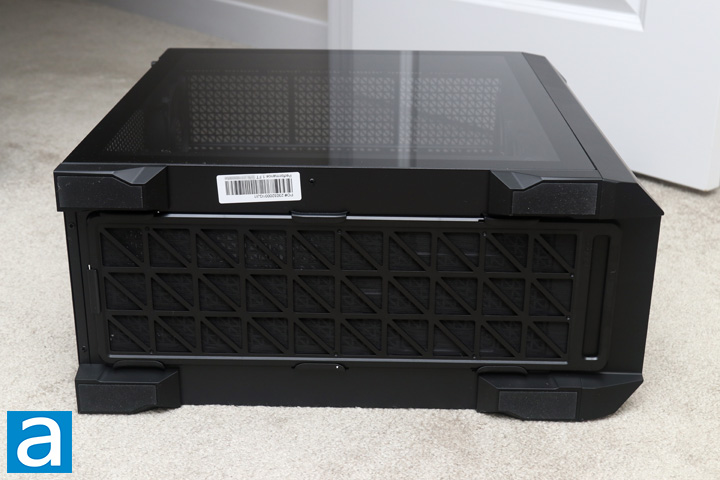 On the bottom, the Antec Performance 1 FT looks as you might expect. Each corner has a large foot with rubber padding underneath to prevent vibrations between the case and the surface it sits on. It also keeps the case from sliding on hard and smooth surfaces. Together, the four feet raise the Performance 1 FT above the surface by 2.2cm, which should allow air to flow in and out. This is important as the bottom area is also where ventilation exists for intake to the power supply. As you can see, the middle area holds a large mesh filter that is held on a plastic frame. It can be removed from the front for cleaning, which is the ideal place of removal. A label with the serial number can be found on one side. Otherwise, there is not too much else to see here, so let us move on.