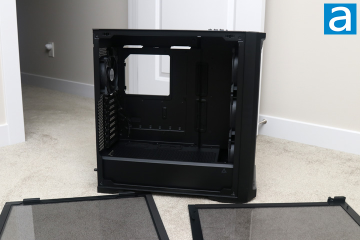 Getting to the inside of the Antec Performance 1 FT requires taking off the two side panels, which is a straightforward process. Both are secured to the back of the case with captive thumbscrews. Once you loosen these screws, the panels can be popped off their ball and socket joints at the top. There are also two latches at the bottom of the pane of glass to aid in aligning the panel to the case. Around both tempered glass panels, we have an opaque black rim to hide any handling marks from showing up on the glass. The back is lined with a metal frame around the rim with thin foam strips down the sides of the glass to dampen any vibration or noise created between the panel and the frame. Finally, the two side panels are tinted to hide a bit more of your cabling and anything else you might want concealed.