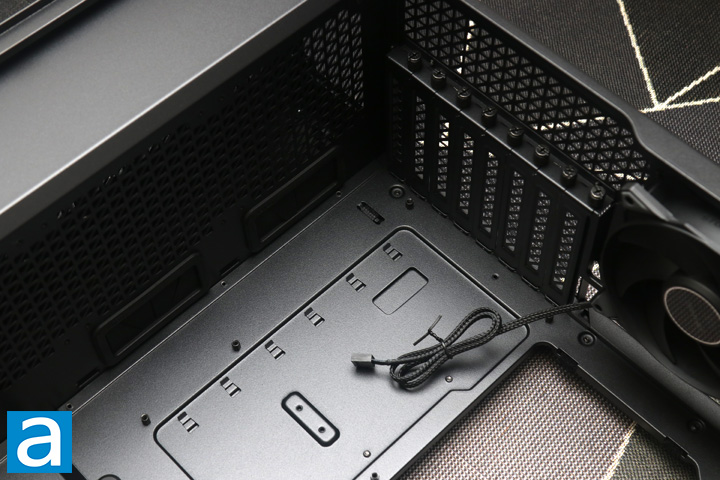 Down to the bottom, we can see the expansion slot covers. There is a total of eight slots, which is typical for a full-tower case. These slots feature a bridgeless design. At the bottom, you can see the perforations on the divider between the power supply and the rest of the case. Once again, the hole pattern matches the other perforations around the Antec Performance 1 FT. You can mount up to three more 120mm fans on top of the power supply shroud if you need more airflow, which will presumably draw air from the bottom of the case. There are also two large holes at the back for connecting front I/O and other headers at the bottom of your motherboard. They have rubber grommets on them, which will help in hiding cable clutter. There is no hole closer to the front to plug in the necessary PCIe power cables for your graphics card.