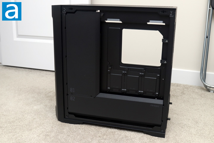 On the flip side of the Antec Performance 1 FT, we have two shields to help with hiding cables. This is necessary given the fact this side has a tempered glass panel, and therefore it reveals how well or how poorly you manage your extra wires. Removing the two sections requires a screwdriver, as there are two screws that connect the two metal plates together. Once removed, you can loosen the thumbscrew at the top and slide out the first plate, marked by a "01", and then the second plate.