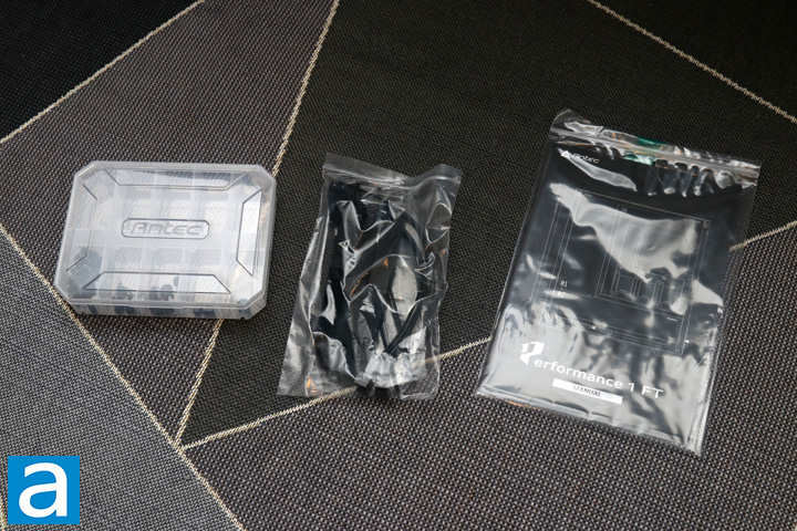 One more thing I should mention before I install into the Antec Performance 1 FT is the included accessories kit, which is quite a nice inclusion. This divided box helps with organizing all the screws. It would have been nice to see some labels for each of the screws, but I should not be complaining too much. In addition, we have a bag that holds some extra Velcro straps, zip ties, and the aforementioned three-in-one fan cable. Finally, some documentation is included to walk users through the installation process and go through the warranty information. Antec covers their Performance 1 FT for two years, which is on par with the rest of the competition.