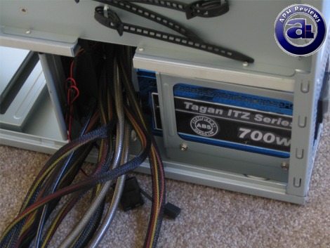 I took a Tagan ITZ 700W power supply and installed it into the power supply chamber. It took me a while to figure out which ways we should lead the cables out by default, and from what I can see we should lead it out towards the back of the motherboard tray -- the place where no one ever cares or looks at, haha.